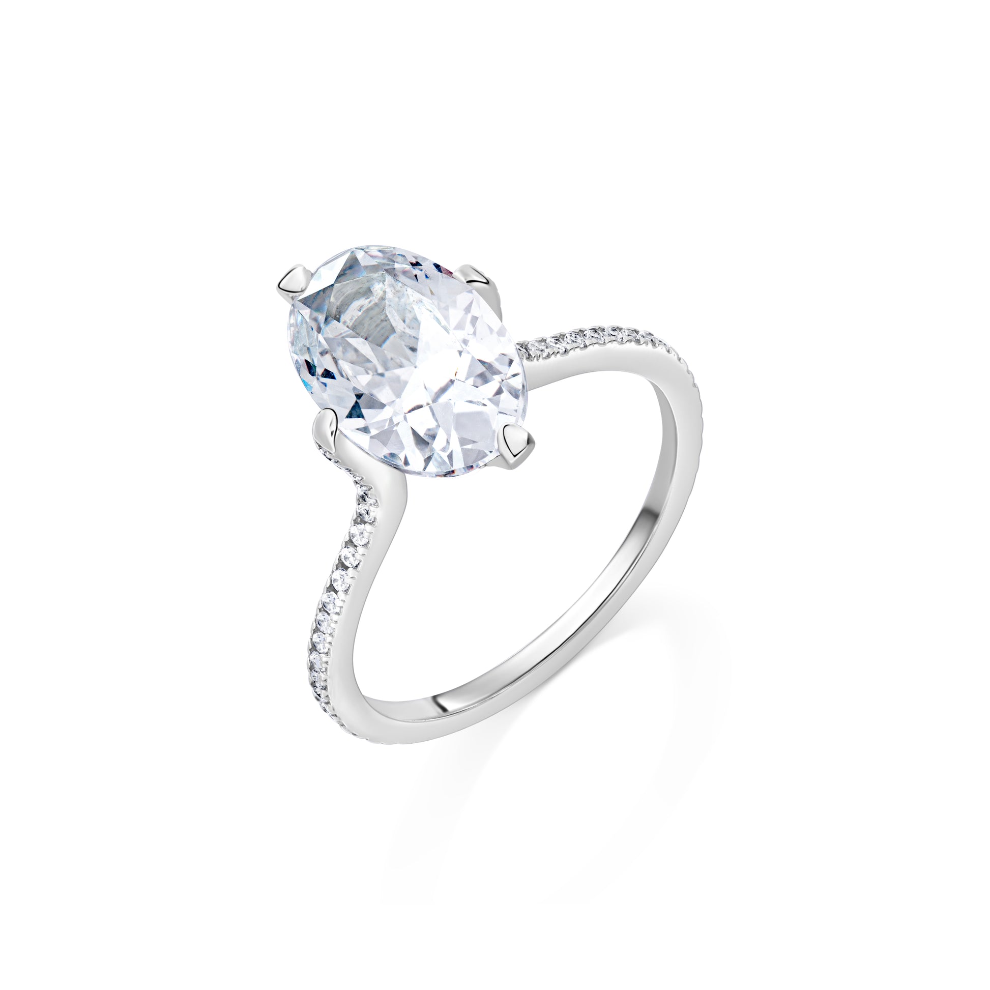 | An elegant silver ring, decorated with large Cubic Zirconia, will be the perfect gift for a woman in honour of the engagement day. The elegant jewellery is made of 925 Sterling Silver and covered with a thin layer of rhodium, which protects the precious metal from scratches. A large Oval cut Zircon, securely held by curly mounts, immediately attracts attention with its iridescent play of facets. The thin graceful rim is decorated with a scattering of small zircons. The sheen of silver effectively sets off the transparent depth and bright radiance of skilfully cut crystals. |